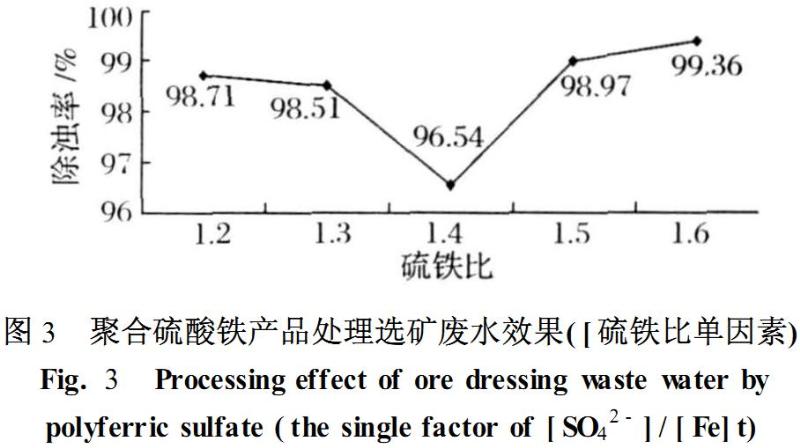 制備聚合硫酸鐵實(shí)驗(yàn)中硫鐵比單因素實(shí)驗(yàn)。在其他因素相同情況下調(diào)節(jié)不同的硫鐵比([SO42-]/[Fe]t)制備一系列的聚合硫酸鐵,而后測定其處理選礦廢水的性能,數(shù)據(jù)見圖3.