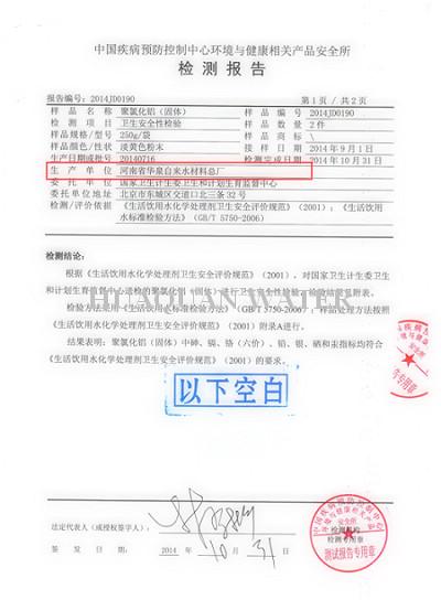 河南華泉總廠在國家衛(wèi)生部抽檢中,聚氯化鋁產(chǎn)品順利通過國家衛(wèi)生部質(zhì)量檢測。各項指標(biāo)均符合國家要求。