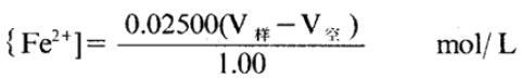 精確移取1.00mL試樣于250mL錐形瓶中,加入10mL濃鹽酸,20mL 2mol/LHSO4-H3PO4混合酸,立即加5滴二苯胺磺酸鈉指示劑,小心用0.02500mol/LK2Cr2O7標(biāo)準(zhǔn)溶液滴定至溶液稍變色,此時(shí)再加入50mL去離子水,溶液應(yīng)該呈穩(wěn)定的紫色,即為終點(diǎn)。如果聚合硫酸鐵已合格,則Fe2+≤1g/L,此時(shí)消耗的標(biāo)準(zhǔn)溶液應(yīng)小于等于0.7mL,如果在此范圍內(nèi),則視[Fe2+]=0,可以不做空白實(shí)驗(yàn);如果大于0.7mL,則以1.00mL去離子水代替試樣做空白實(shí)驗(yàn)。