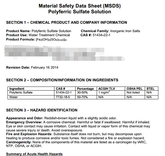 聚合硫酸鐵MSDS用安全說明書